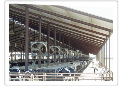 為了達到好的通風效果,風機的安裝位置是牛棚料槽的正上方,風機下沿距離地面2.7米,傾斜角度在15到30度為佳。